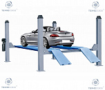 Подъемник четырехстоечный, электромеханический, платформенный. Предназначен для установки тест системы "сход-развал". Хорошо подходит для длинобазных автомобилей. По отдельному заказу подъёмники могут быть укомплектованы тележкой с домкратом для вывешивания передней или задней оси автомобиля. Подъемник комплектуется микропроцессорной системой синхронизации подъёма-опускания платформ.
