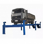 г/п. 20 тонн. Четырехстоечный. Электромеханический. Для ремонта грузовых автомобилей и автобусов на любой ровной площадке. Привод червячный редуктор, с концевыми выключателями нажимного действия, ограничивающими ход каретки. Рабочие гайки повышенной прочности и износостойкости. Многоуровневая система безопасности. По отдельному заказу комплектуется установочными рамами. Поставляется в 2 вариантах Стандарт (в помещение) и ТЗ (Для эксплуатации на улице).
