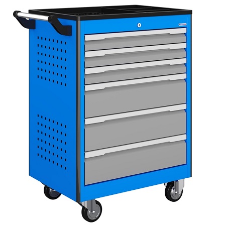 Тележка инструментальная MasterLine комплектуется 7 выдвижными ящиками. Толщина металла 0,8 мм. Цельносварная конструкция корпуса тележки. Центральный замок Euro-Lock. Шариковые направляющие полного выдвижения. Алюминиевая ручка. На боковых стенках тележки выполнена перфорация для установки навесных элементов из нашего каталога.