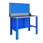 Верстак комплектуется полкой-стенкой, расположенной под столешницей для удобного размещения габаритного инструмента и оснастки. Опорные элементы выполнены сварными из холоднокатаной стали. Все металлические элементы покрыты полиэфирной порошковой краской. Столешница из фанеры толщиной 24 мм, которая покрыта листом оцинкованной стали толщиной 1,2 мм. Глубина столешниц 696 мм. Максимальная масса груза на столешнице - 350 кг.