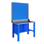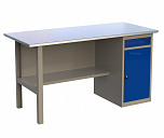 Однотумбовый. Допустимая нагрузка на столешницу 750 кг. Опорные элементы выполнены сварными из холоднокатаной стали. Верстак состоит из опоры, тумбы P7 с дверью и двумя полками и полки-стенки. Все металлические элементы покрыты полиэфирной порошковой краской. Столешница состоит из фанеры марки ФСФ толщиной 24 мм, которая покрыта лаком-антисептиком и листом оцинкованной холоднокатаной стали толщиной 1,2 мм. Размеры (ВхШхГ) 855x1196x696 мм.