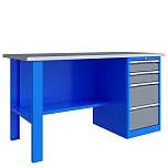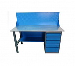 Однотумбовый. Допустимая нагрузка на столешницу 750 кг. Опорные элементы выполнены сварными из холоднокатаной стали. Верстак состоит из столешницы, опоры, тумбы P5 с четырьмя малыми и одним большим ящиком и полки-стенки. Все металлические элементы покрыты полиэфирной порошковой краской. Столешница состоит из фанеры марки ФСФ толщиной 24 мм, которая покрыта лаком-антисептиком и листом оцинкованной холоднокатаной стали толщиной 1,2 мм. Размеры (ВхШхГ) 855x1396x696 мм.