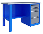 Однотумбовый. Допустимая нагрузка на столешницу 750 кг. Опорные элементы выполнены сварными из холоднокатаной стали. Верстак состоит из столешницы, опоры, тумбы P4 с двумя малыми и двумя большими ящиками, полки-стенки и одинарного экрана с кронштейнами. Все металлические элементы покрыты полиэфирной порошковой краской. Столешница из фанеры марки ФСФ толщиной 24 мм, которая покрыта лаком-антисептиком и листом оцинкованной холоднокатаной стали толщиной 1,2 мм. Размеры (ВхШхГ) 1470x1196x696 мм.