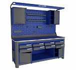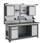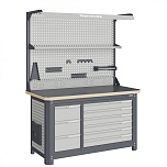 Нагрузка на столешницу 1500 кг. Столешница из листа влагостойкой фанеры марки ФСФ толщиной 40 мм и листом горячекатаной стали толщиной 5 мм. Рама верстака выполнена их холоднокатаной стали. Модуль верстака выполнен сварными. Ящики в модулях устанавливаются на шариковых телескопических направляющих полного выдвижения. Квадратная перфорация для установки крючков, держателей. Размеры: 1982x1993x743 мм.