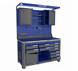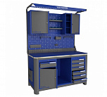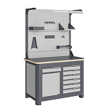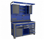 Нагрузка на столешницу 1500 кг. Столешница из листа влагостойкой фанеры марки ФСФ толщиной 40 мм и листом горячекатаной стали толщиной 5 мм. Рама верстака выполнена их холоднокатаной стали. Модуль верстака выполнен сварными. Ящики в модулях устанавливаются на шариковых телескопических направляющих полного выдвижения. Квадратная перфорация для установки крючков, держателей. Размеры: 1982x1493x743 мм.