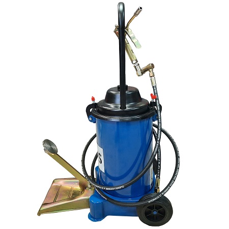 Удобный — в бак входит ведро смазки 20 кг. Экономия денег на смазке до 2-х раз. Экономия времени на заправке шприцов. Для всех пластичных смазок NLGI3. Пневматический. На колесах. Продавливает «ЗАБИТЫЕ» тавотницы. Давление смазки 300-400 Атм. Пистолет с наконечником под тавотницы производительность 850 г/мин. Для шприцевания шарнирных соединений (тавотниц, крестовин, подшипников и т.д.). Заправка смазкой из ведра, тубы, бочки. Высота бака 340 мм. Диаметр бака Ø 280 мм.