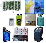 Комплект для заправки автомобильных кондиционеров состоит: автоматическая установка для заправки кондиционера, фреон, масло, течеискатель хладагента, набор золотников, ультрафиолетовая добавка, набор резиновых колец, набор колпачков, течеискатель электронный и цифровой термометр.