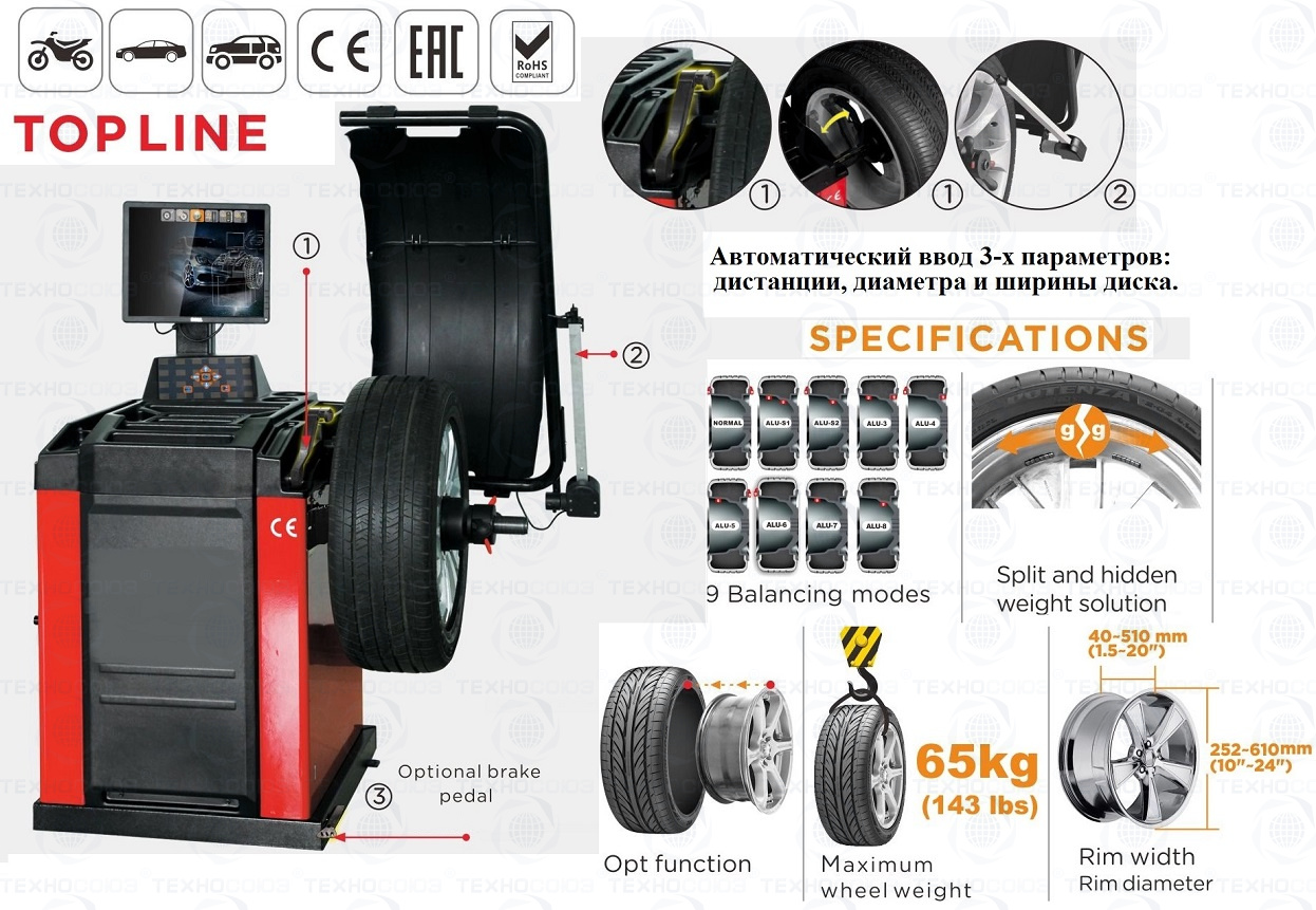 Автоматический балансировочный станок Техносоюз TS-700. Данный балансировочный станок предназначен для балансировки колёс легковых автомобилей, мотоциклов и лёгких грузовиков. Для штампованных, литых, кованых дисков шириной 1,5÷9”, Ø 10÷24”.