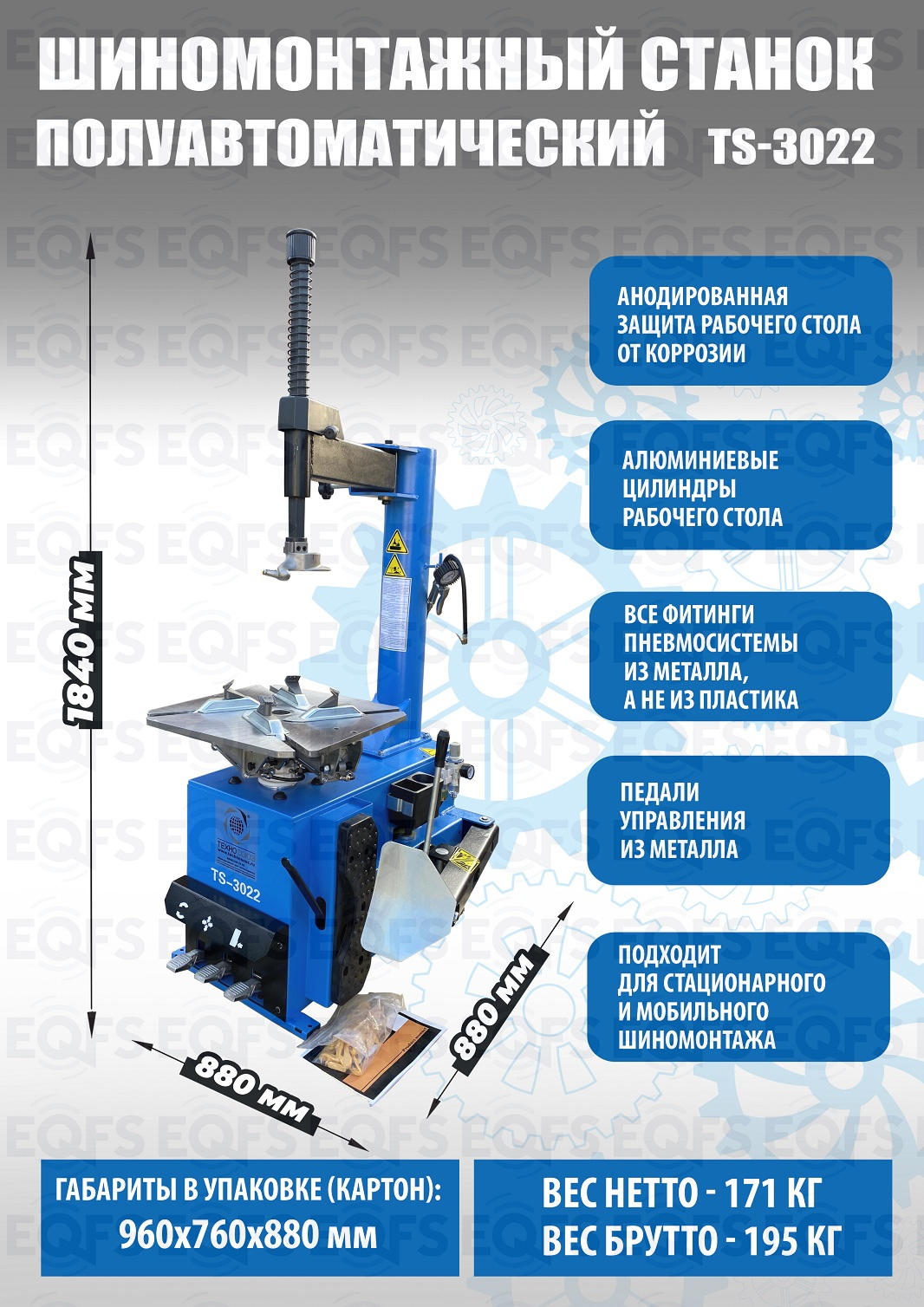 Полуавтоматического шиномонтажного станка TS-3022 предназначен для монтажа и демонтажа колес легковых автомобилей, легких грузовиков, не больших автобусов и коммерческой техники. Внешний зажим 11-21”. Внутренний зажим 12-24”. В комплекте: пистолет для подкачки шин + монтажка + регулятор давления с влагоотделителем и манометром. Рекомендуется для постов со средней и высокой проходимостью. Напряжение шиномонтажных станков 220В или 380В на выбор.