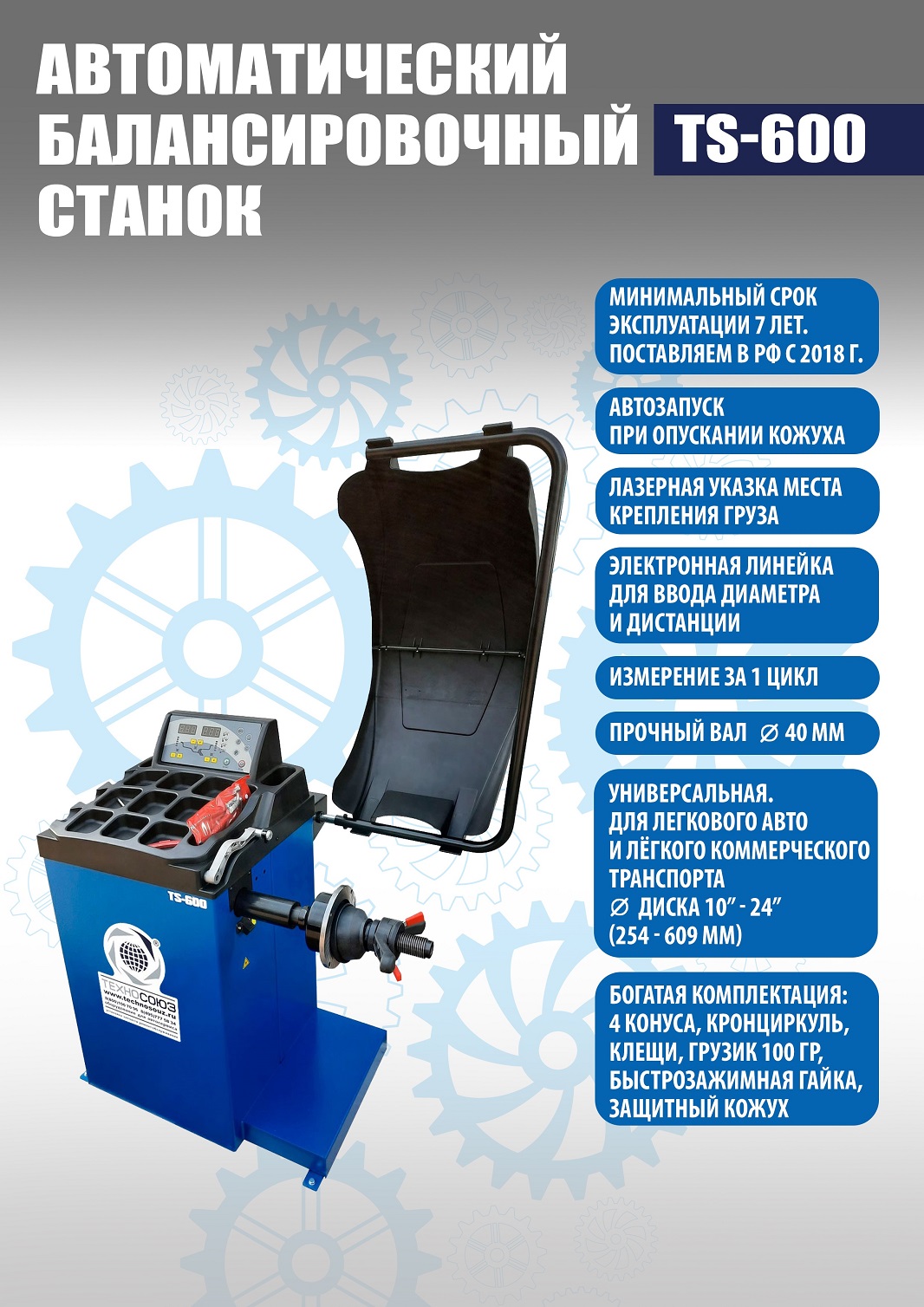 + TS-600 Балансировочный станок. Автомат. Для колес легковых автомобилей, мотоциклов и легких грузовиков с диаметром диска с резиной до 800 мм. Размеры диска: ширина 3–10” (76-254 мм), диаметр диска 10–24” (254÷609 мм). Вал- 40мм. Гарантия 18 мес – наш монтаж, 12 мес – самостоятельная установка. В комплекте: кожух с автозапуском + клещи + кронциркуль + быстрозажимная гайка + набор конусов.