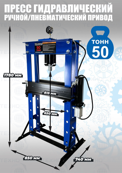Пресс пневмогидравлический 50 тонн, для автосервиса. Ход поршня 0-230 мм. Рабочее окно 650х815 мм. Управление ручное/пневматическое, манометр, ручная лебедка. Рекомендуется для выпрессовки подшипников, деталей машин, втулок и т.п. в автосервисе, Гараже и СТО. Цвет синий. Доставка по РФ и ТС. Подъёмная площадка регулируется по высоте и фиксируется в требуемом положении.