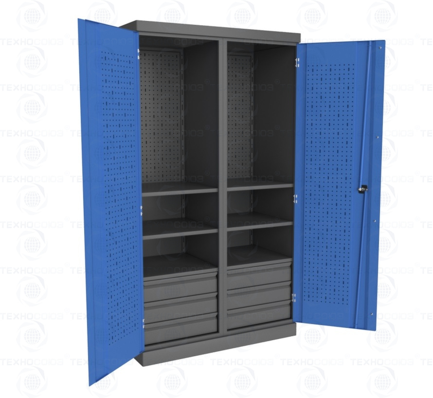 Шкаф инструментальный серии «PROFFI» предназначен для хранения оснастки, приспособлений и инструмента на рабочих местах в мастерских, цехах и других производственных зонах. Шкаф изготовлен из листовой стали и обеспечивает надежное запирание дверей ригельной системой. Шкаф данной модели может комплектоваться либо полками PROFFI(1) и ящиками PROFFI(1) – по всей ширине шкафа, при этом максимальное количество полок и ящиков по высоте - 14 штук.