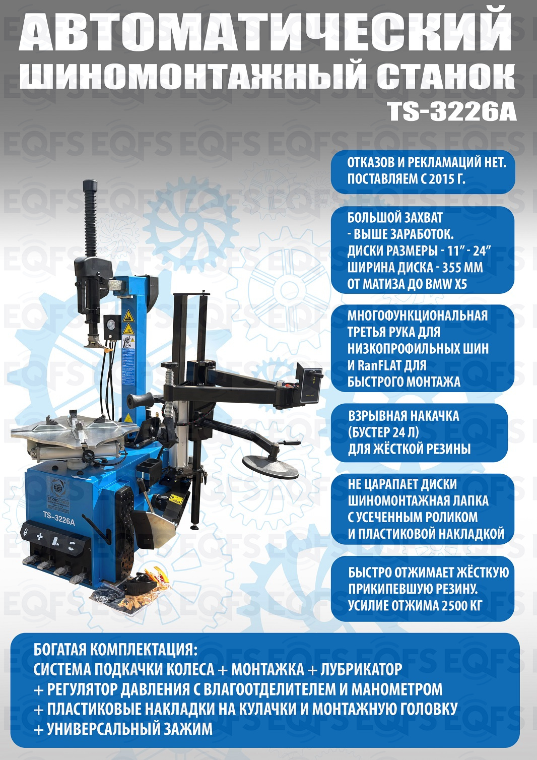 Автоматический шиномонтажный станок TS-3226A Оптимальный вариант цена/функционал. Самый продаваемый автоматический станок! В комплекте: встроенный увеличенный бустер емкостью 24 литра (взрывная подкачка) + третья рука для работы с низкопрофильными шинами и RanFlat. Для колес легковых автомобилей, легких грузовиков, микроавтобусов и коммерческой техники. Внешний зажим 11-21”. Внутренний зажим 12-24”. Поставляем на 220В и 380В.