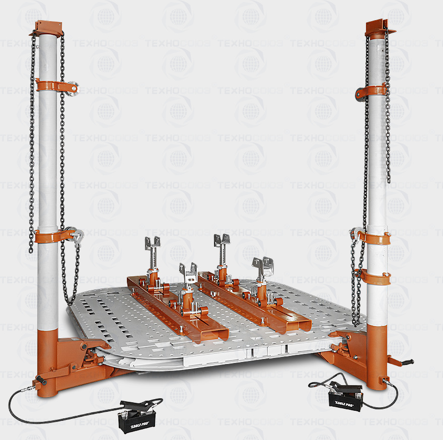 Силовые устройства башенного типа высотой 3 м оснащены гидроцилиндрами 10 т и позволяют быстро и эффективно восстановить геометрию вертикальных элементов каркаса и крыши кабины. Для управления силовыми устройствами используются пневмогидравлические насосы.