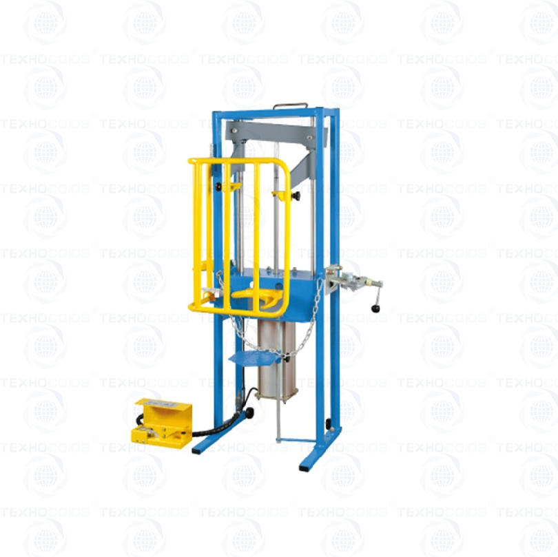 Стяжка для пружин пневматическая. Напольная установка. Оборудование для стоек амортизаторов представляет собой стяжку пружин c пневматическим приводом. Стяжка пружин используется для замены стоек подвески типа Макферсон. Стяжка оснащена гидравлическим цилиндром усилием 1200 кг. Рабочий ход штока 350 мм. Для легковых автомобилей, микроавтобусов, легких грузовиков.