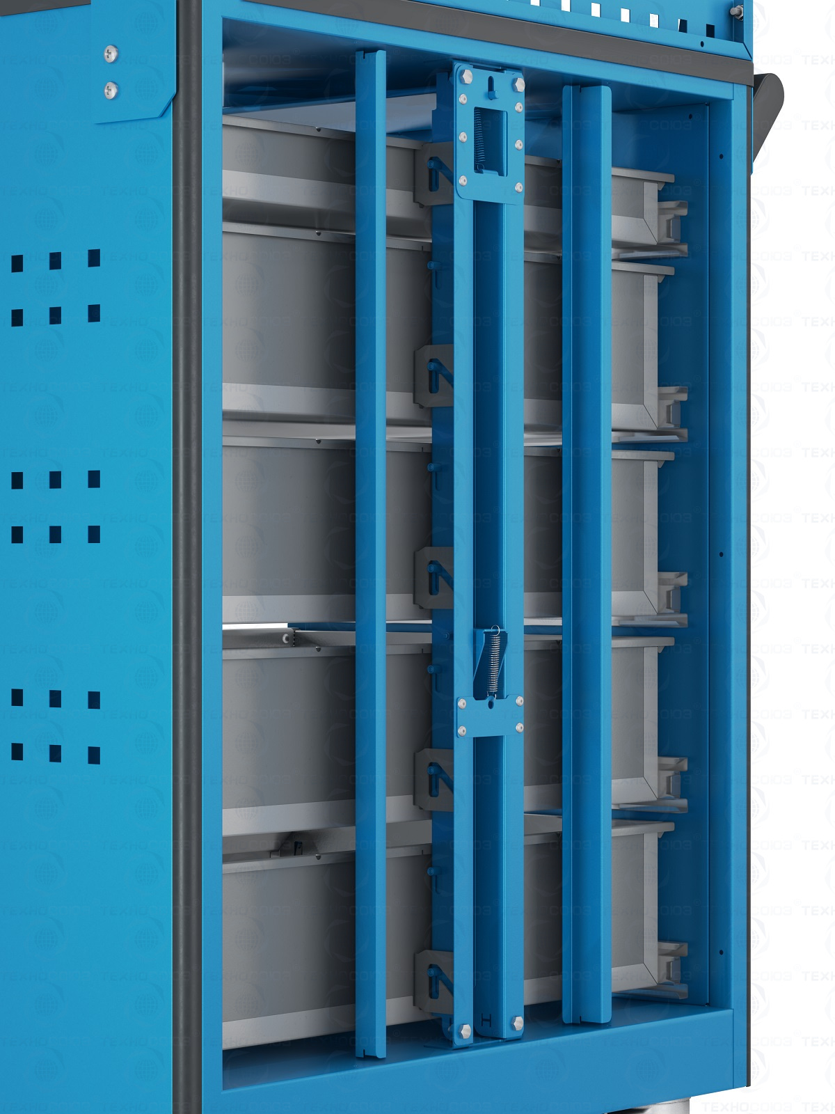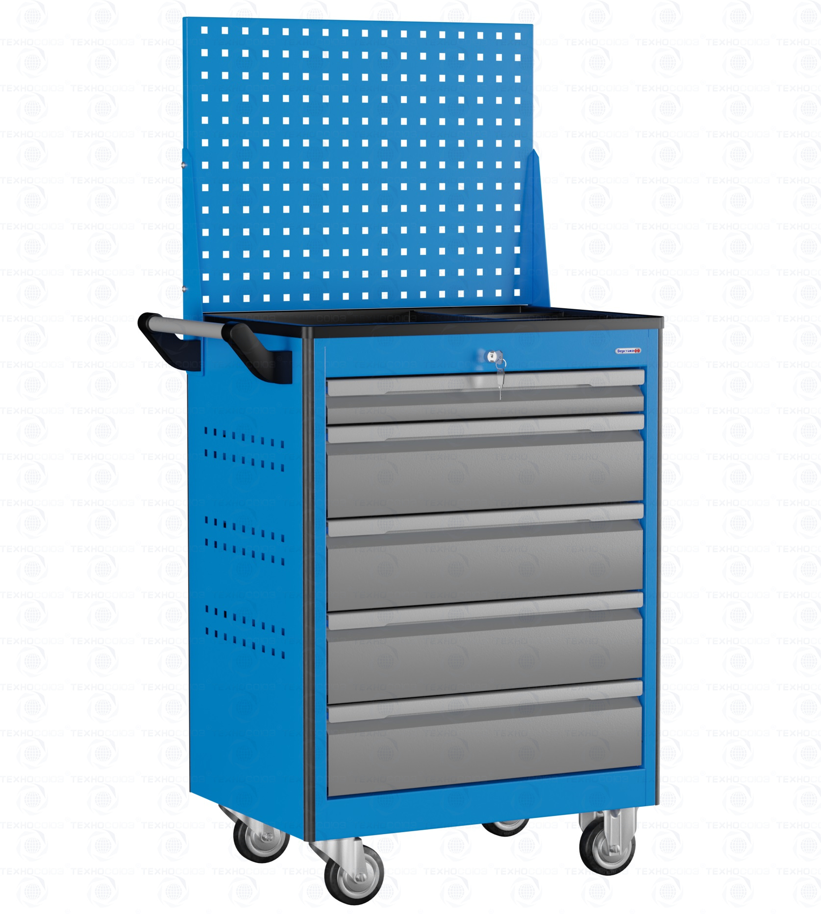 Перфоэкран предназначен для размещения навесных элементов.  Корпус тележки сварной. На боковых стенках корпуса выполнена квадратная перфорация 12х12 мм с шагом 38 мм для установки крючков, держателей и других аксессуаров.  Ящики устанавливаются на шариковых телескопических направляющих полного выдвижения. Обеспечен свободный и плавный ход ящиков даже при полной загрузке. На лицевой панели каждого ящика установлена ручка-накладка. Каждый ящик снабжен клавишной системой антиоткрывания из оцинкованной стали, препятствующей самопроизвольному выдвижению ящиков, например, при наклоне или перемещении тележки.  Тележка оснащена системой антиопрокидывания новой конструкции, которая блокирует открывание ящиков, если один из них уже выдвинут. Это препятствует смещению центра тяжести и предотвращает опрокидывание тележки.  На углах тележки установлены специальные резиновые защитные бамперы. Тележка оснащена четырьмя колесными опорами с диаметром колеса 100 мм. Две поворотные колесные опоры с тормозом и две поворотные колесные опоры без тормоза.