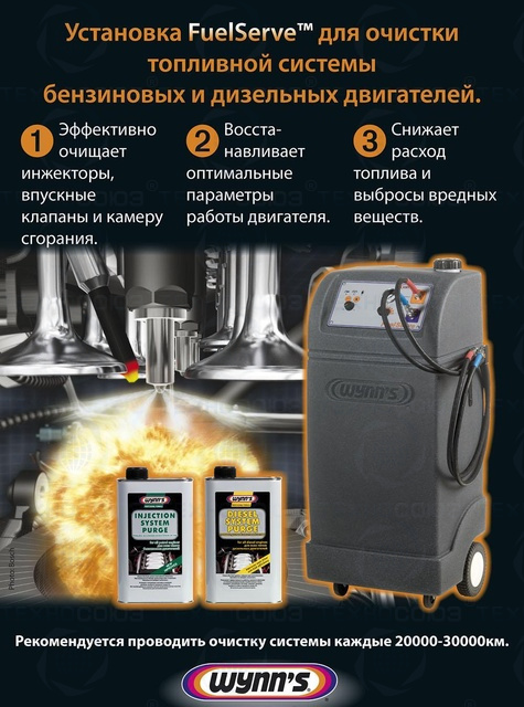 Применяемая жидкость: для бензиновых двигателей – Injection System Purge, для дизельных двигателей Diesel System Purge. Установка мобильна и проста в эксплуатации.